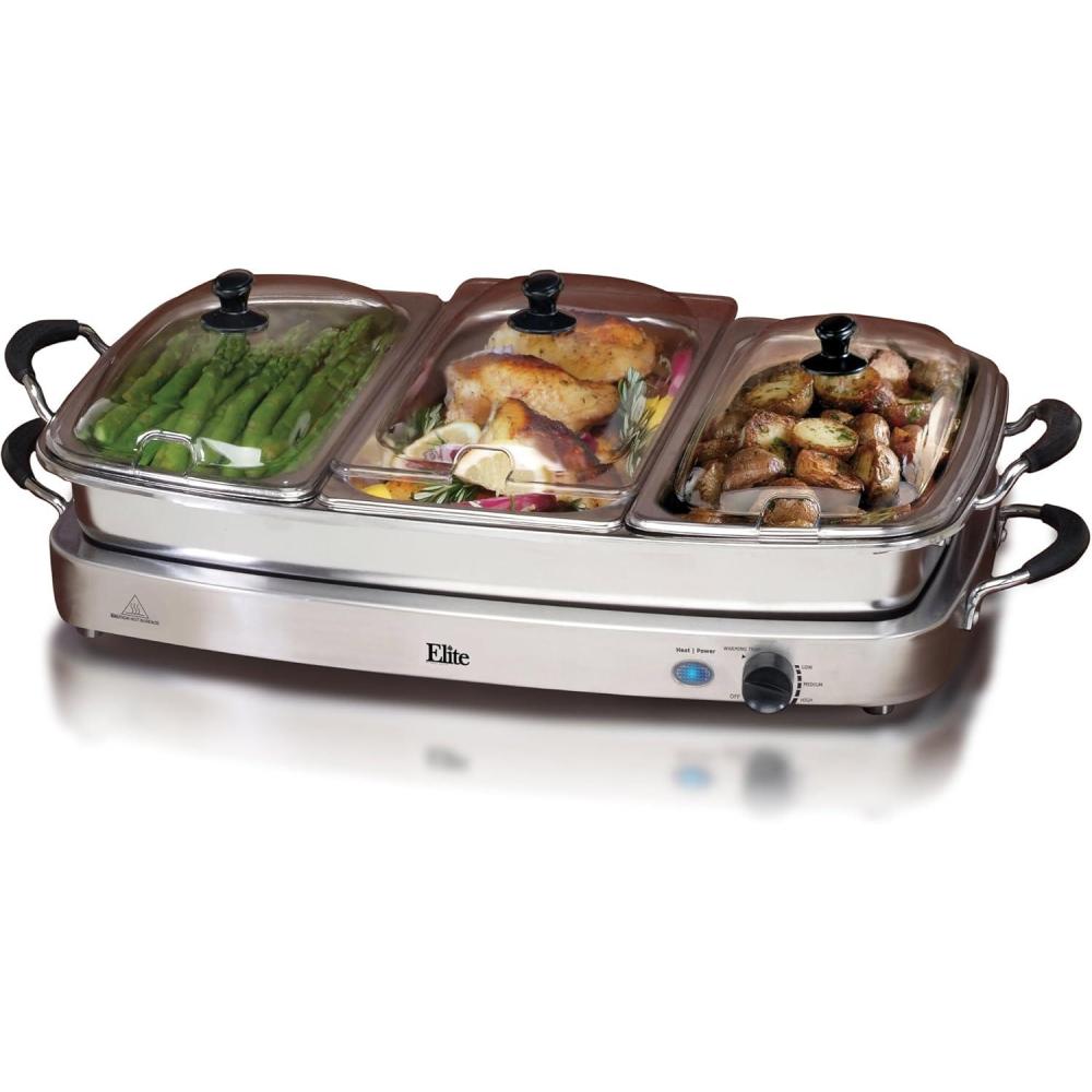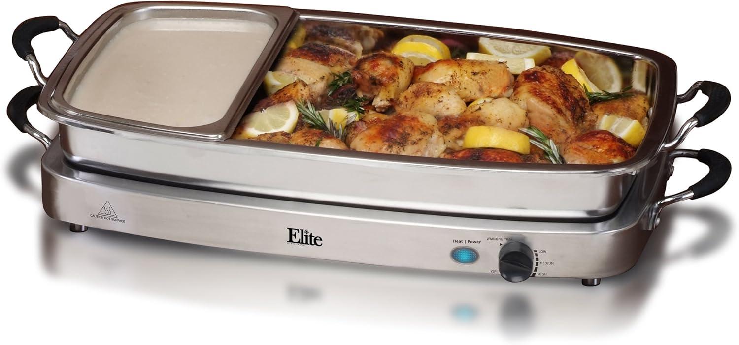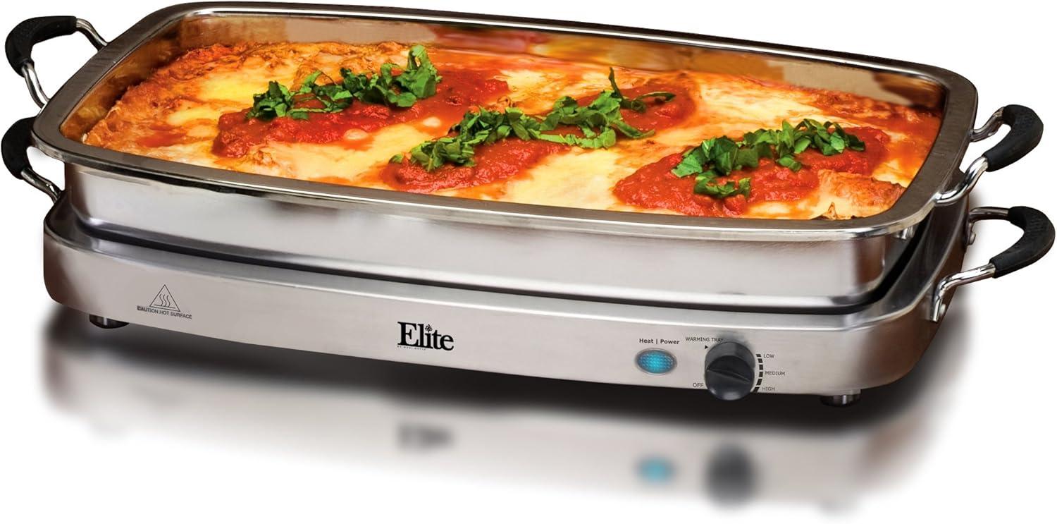 Keep the party going all day and all night with the Stainless Steel Buffet Server and Warming Tray by Elite Gourmet. The specially designed buffet server is equipped with a total of three brushed stainless steel 2.5 quart buffet trays and an oven-safe 7.5 quart casserole pan with silicone handles. Use this large casserole pan to cook directly in the oven and transfer it directly to the buffet server ready to serve. You can also choose to not use the included pans and use your own dinnerware or foil pans by setting them directly on the flat 8-inch by 18-inch warming tray. You can keep food warm for hours at all your social gatherings without using an open flame or warming water. Serve cheesy garlic mashed potatoes, hot gravy and tender turkey breasts all at the same time. Each 2.5 Quart pan has its own BPA-Free clear dome lids with built-in slot for serving utensils. Featuring Low, Medium and High temperature settings, you can easily adjust to keep food piping hot and ready for serving, or set to low while guests mingle. The sleek stainless-steel design making it easy to clean and dishwasher safe.