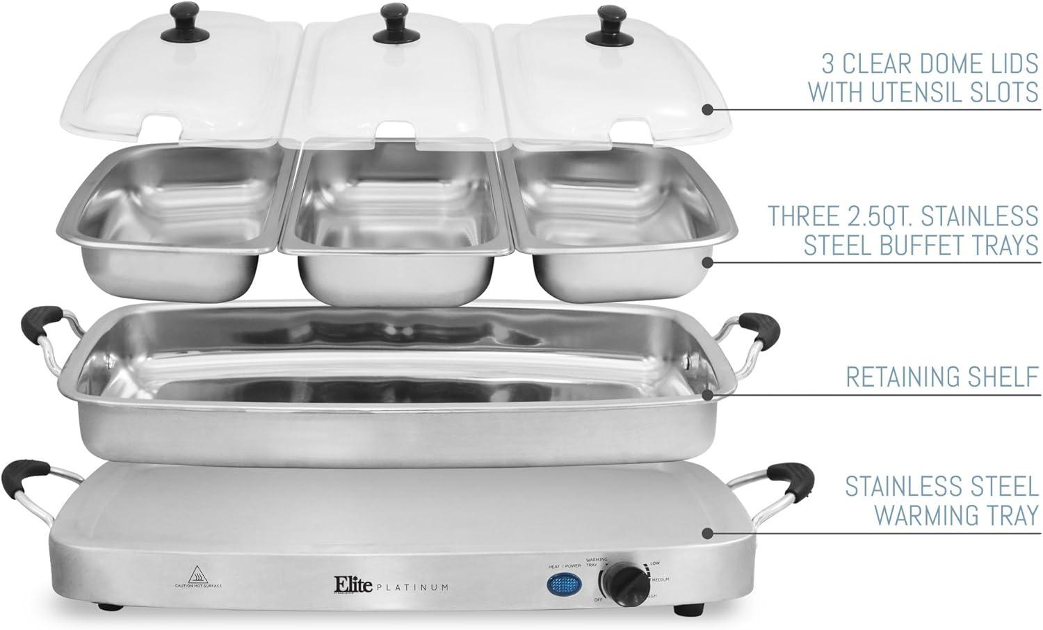 Elite Gourmet EWM-9933 Triple 3 x 2.5 Quart Trays Buffet Server 7.5 Qt Oven Safe Pan Food Warmer, Temperature Control, Clear Slotted Lids, Perfect for Parties, Entertaining & Holidays, Stainless Steel(7.5 Quart / 3 Trays)