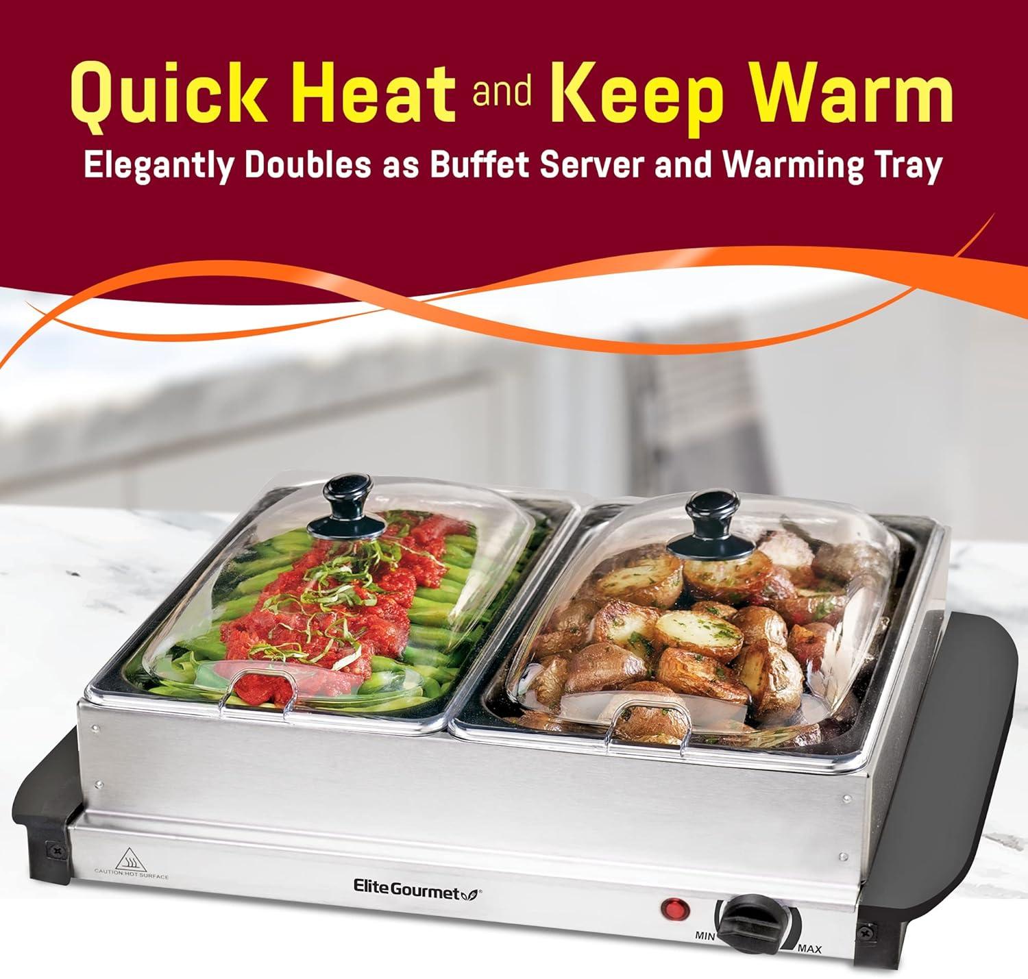 Keep the party going all day and all night with the Stainless Steel Buffet Server and Warming Tray by Elite Gourmet. The specially designed buffet server is equipped with a total of three brushed stainless steel 2.5 quart buffet trays and an oven-safe 7.5 quart casserole pan with silicone handles. Use this large casserole pan to cook directly in the oven and transfer it directly to the buffet server ready to serve. You can also choose to not use the included pans and use your own dinnerware or foil pans by setting them directly on the flat 8-inch by 18-inch warming tray. You can keep food warm for hours at all your social gatherings without using an open flame or warming water. Serve cheesy garlic mashed potatoes, hot gravy and tender turkey breasts all at the same time. Each 2.5 Quart pan has its own BPA-Free clear dome lids with built-in slot for serving utensils. Featuring Low, Medium and High temperature settings, you can easily adjust to keep food piping hot and ready for serving, or set to low while guests mingle. The sleek stainless-steel design making it easy to clean and dishwasher safe.