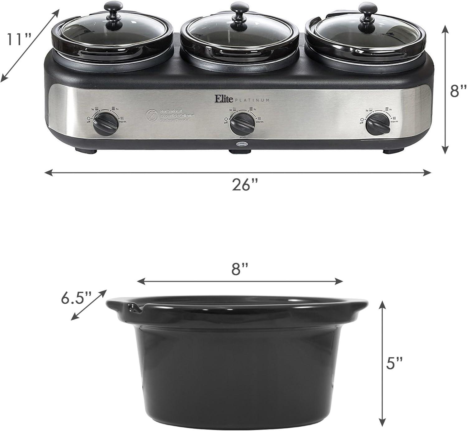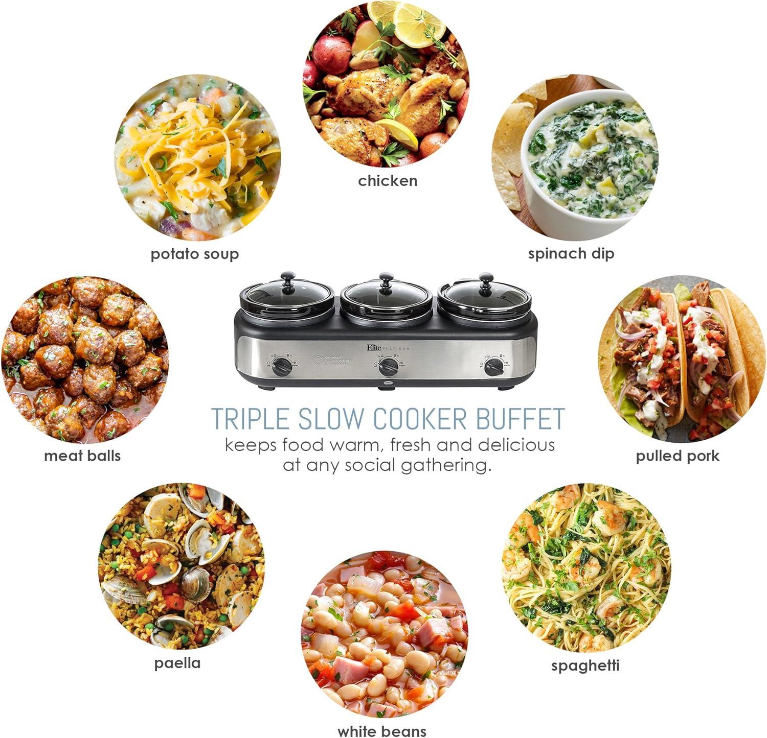 MULTI-USE: The Elite triple slow cooker buffet was designed to accommodate today’s busy lifestyle. Three separate dishes can be prepared and served at the same time. As a buffet server It will be a welcome addition during any family gathering or holiday.