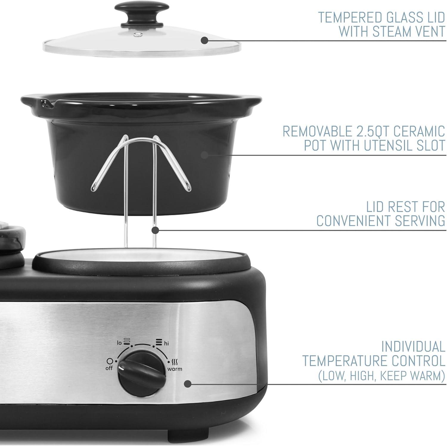 EASE OF USE: The Elite triple slow cooker buffet is constructed with three removable 2.5Qt stoneware oval pots to make it easier to serve delicious foods. A unique lid rest has been designed so no need to worry about where to place the lid when serving.