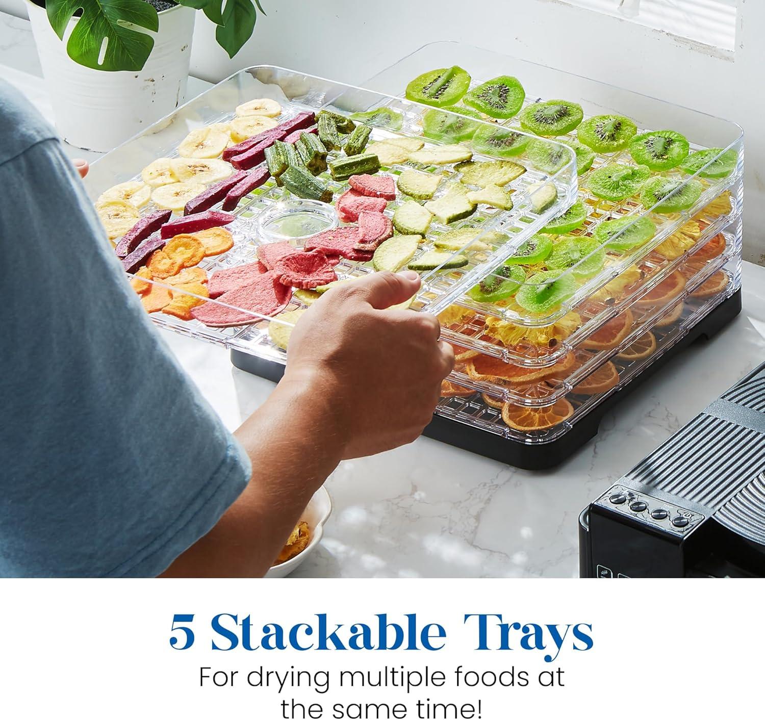 Save money and time by creating your own healthy snacks quickly and easily at home with the Elite Gourmet 4 stainless steel tray snack maker food Dehydrator. It's sleek, compact and contemporary design features 350 watts of drying power, and generates maximum speed and quality for Dehydrating fruits, vegetables, and jerky. It's never been so easy to whip up a batch of banana, apple or kale chips or dry your favorite vegetables, herbs and even flowers! features a swing-out door W/ clear viewing window to watch drying progress and a digital control panel W/ adjustable timer and temperature buttons. Includes dishwasher safe parts: 4 removable stainless steel dehydrating trays measuring at 9.3” x 7.1”.
