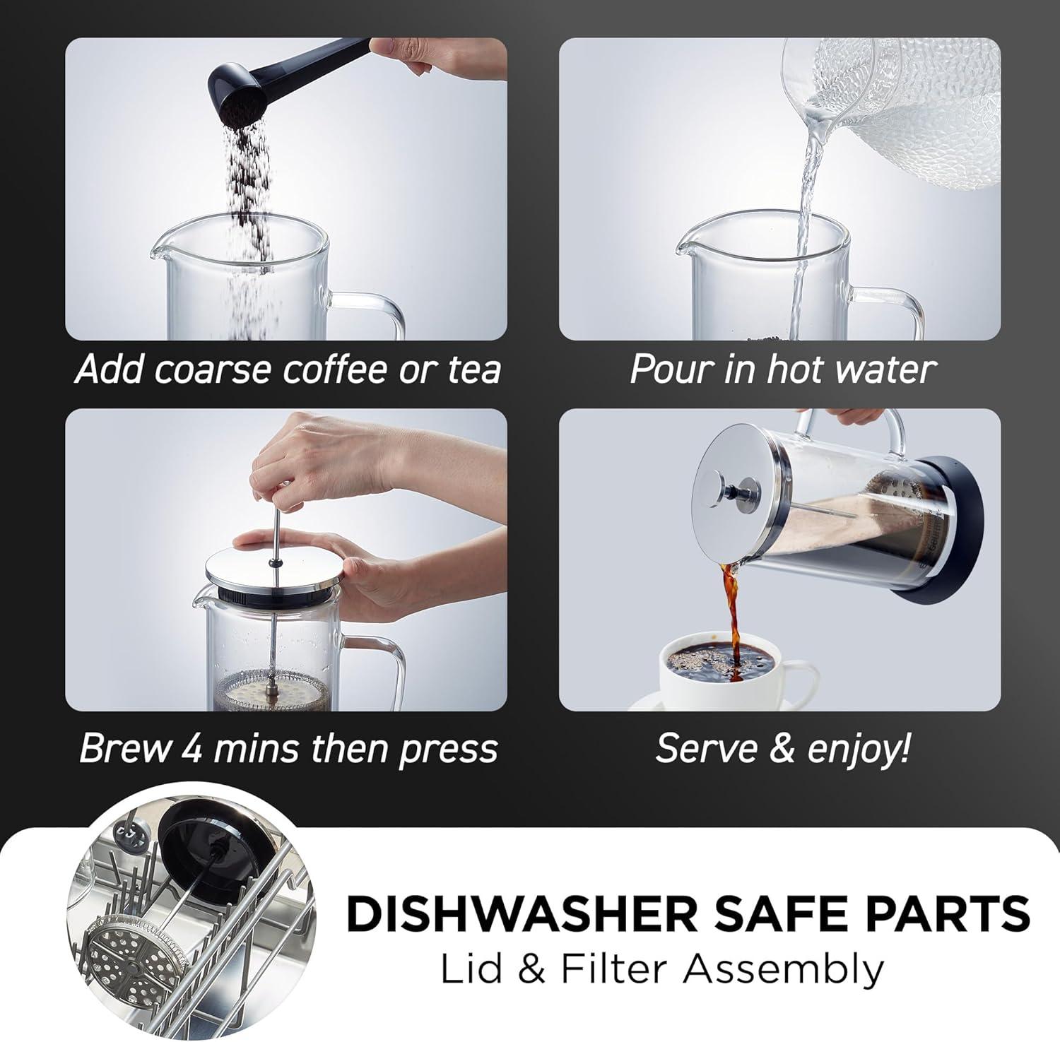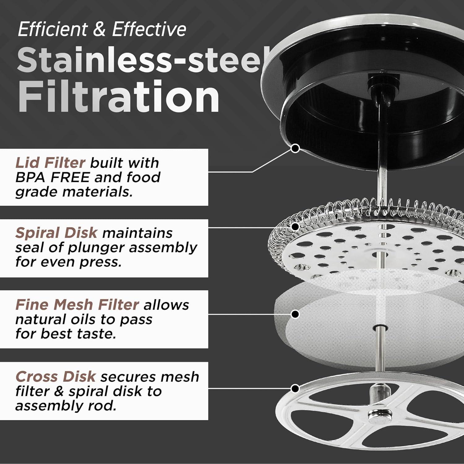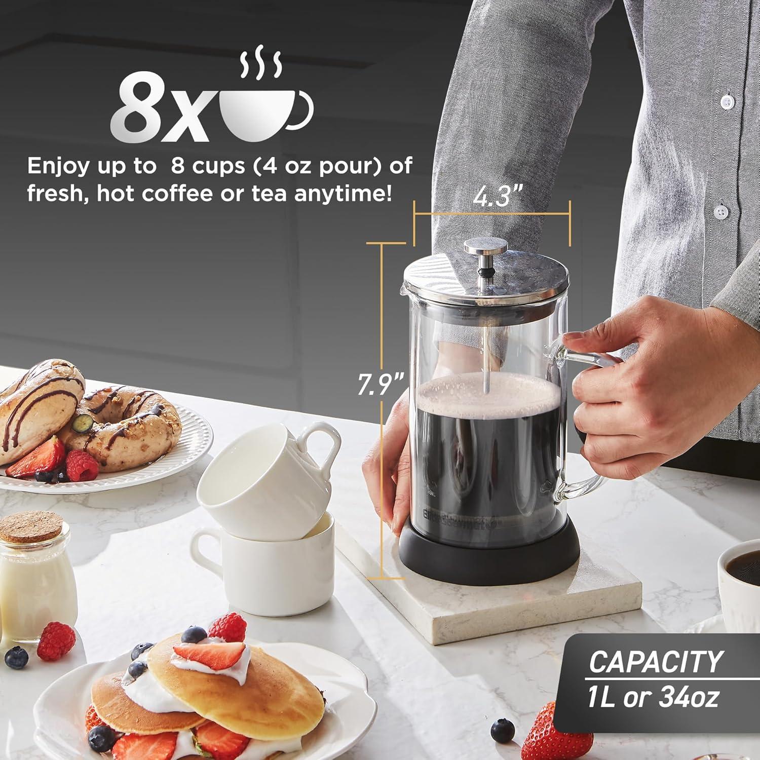 Start your day off with the Elite Gourmet Classic French Press Coffee Maker. The superior quality borosilicate glass is 3X thicker (than competitors) and provides exceptional heat retention. The stainless-steel filter & plunger assembly is designed to provide supreme, debris free filtering and is easy to disassemble, clean and re-assemble. French pressed coffee is a timeless classic and you determine the strength and taste of your favorite coffee. It’s simple to use; just add desired amount of your favorite, fresh coffee grounds (coarse ground is recommended) add desired amount of hot water, stir, steep, plunge & pour! The robust, full-bodied and flavorful coffee is a great way to jump start your day or enjoy a cup anytime during the day. Theres no need to stop at a local coffee house just to make it through the day. Enjoy your favorite ground coffee without waste of using k-cups, pod or paper filters. Cleanup is a cinch; all parts can be hand washed or top-rack dishwasher safe. You’ll feel the value when you hold and use this supremely designed 1 Liter French Press Coffee Maker by Elite Gourmet.