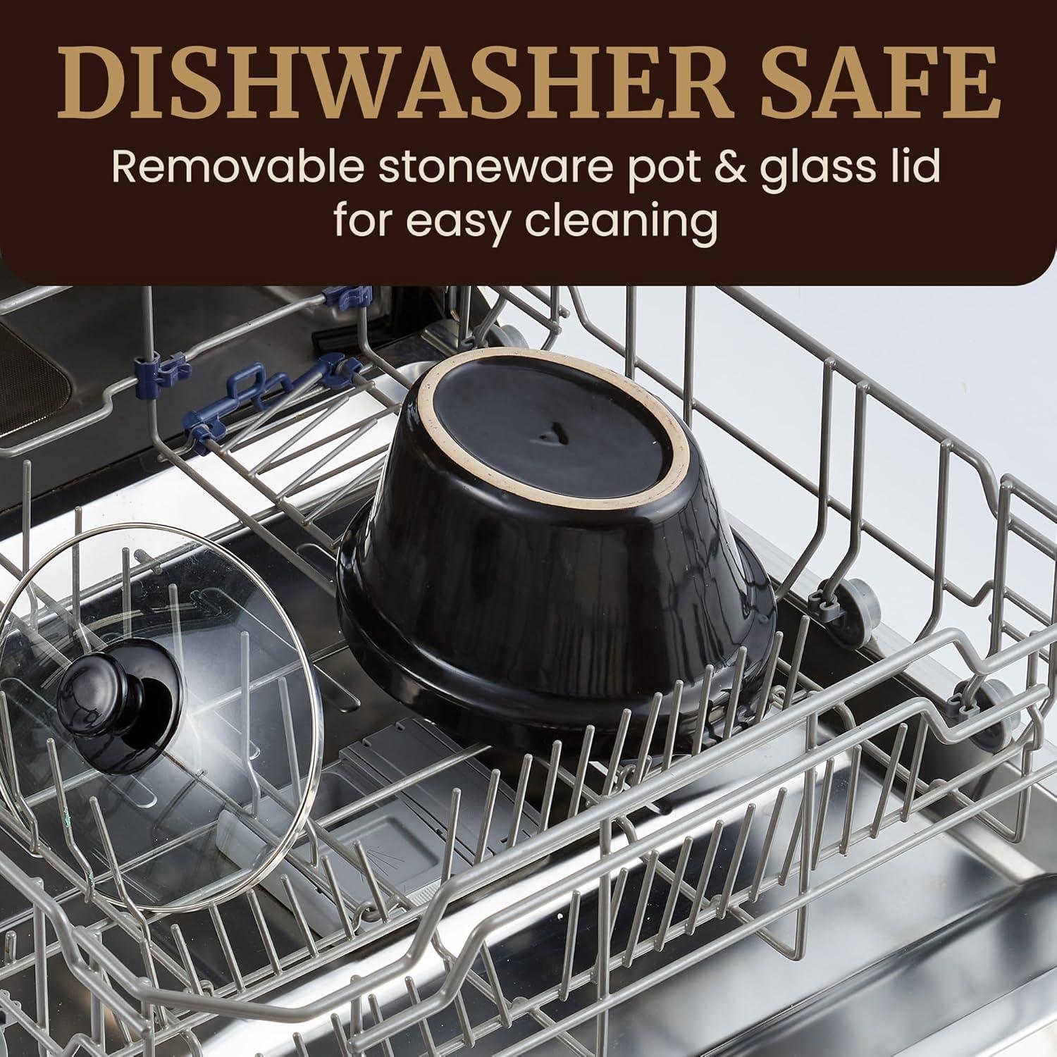 FAST, EASY CLEAN-UP with our dishwasher-safe clear tempered glass lid and removable oval stoneware pot. The exterior heating base can be wiped clean with a damp cloth to maintain its pristine appearance.