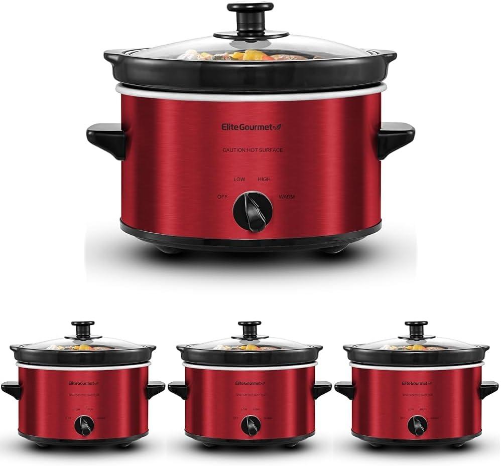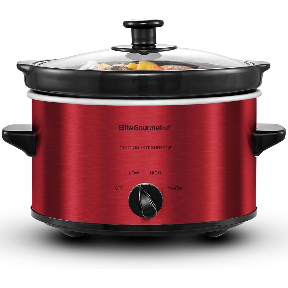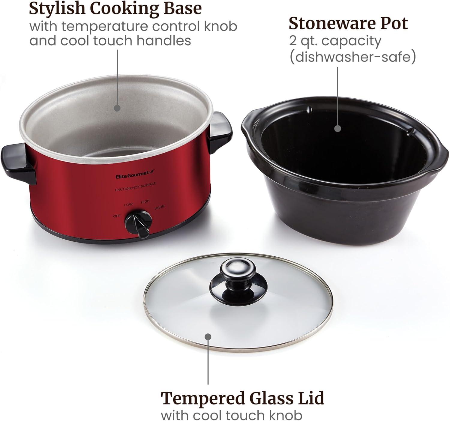 The Elite Gourmet 2-Quart Slow Cooker is the perfect appliance for cooking and serving meals for a small family. It features defrost, low and high temperature settings perfect for making chili's, stews, sauces and even a 2 lb. chicken or roast and, with an attractive red stainless steel finish, it's the perfect addition to any kitchen! It includes a removable inner stoneware pot that's easy to clean, a tempered glass lid with metal rim for easy viewing and cool-touch handles and knob for safe handling.