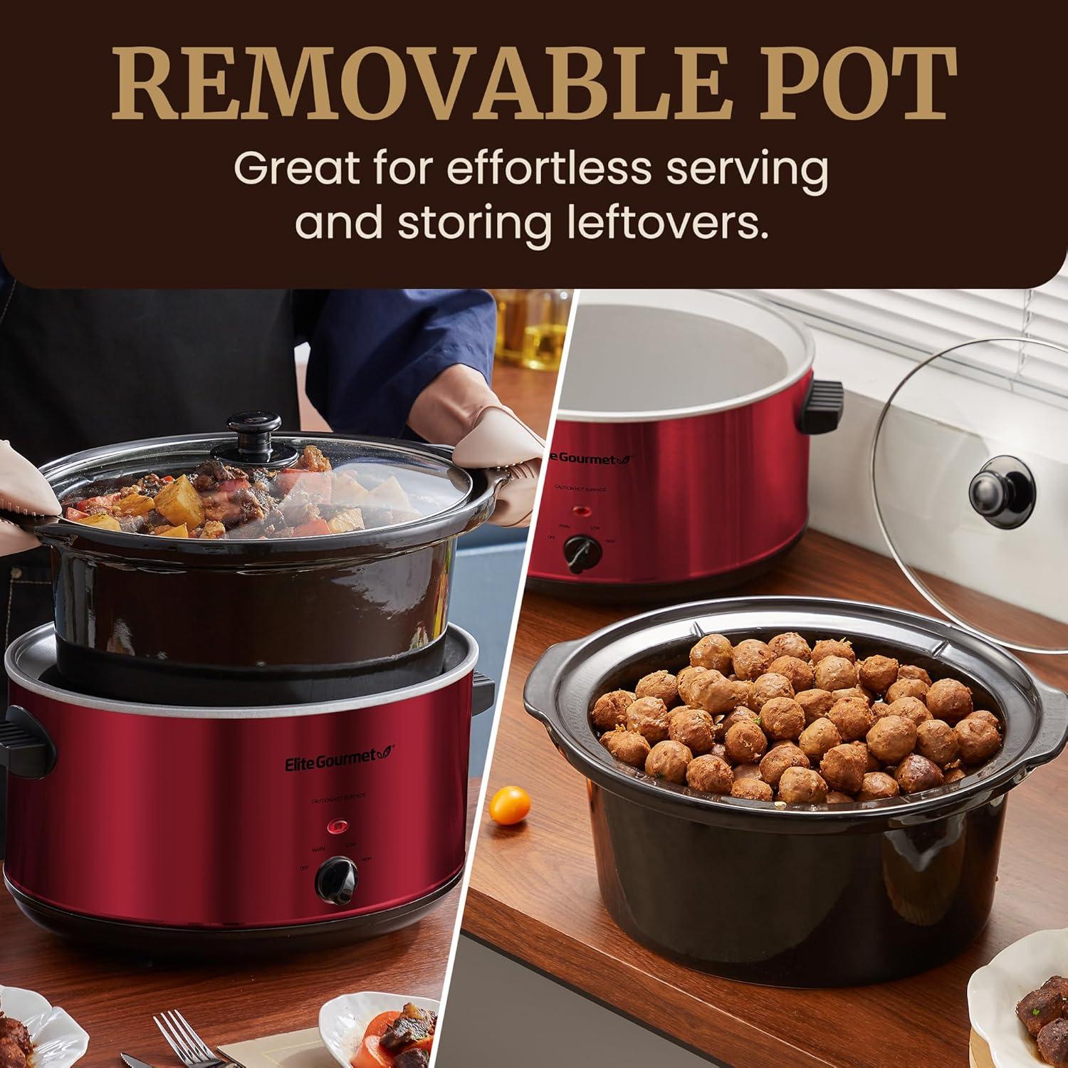 Get creative making healthy, home-cooked meals with the help of the easy-to-use Elite Gourmet 8.5 Qt. Slow Cooker. It features convenient low, high and keep- warm settings. An 8.5 quart oval removable stoneware pot that nicely accommodates anything from vegetarian stew, grandma's pot roast, soups, casseroles, curries and more. The super-sized 8.5 Qt. stoneware pot is huge and due to its oval shape, you can slow cook those extra-large cuts of meat ensuring there is always enough to go around. The appliance delivers consistent, even heat, while its clear tempered-glass lid traps in moisture and nutrients for delicious results and allows easy viewing of the cooking cycle. Attractively housed in a festive red with black accents, it is a great addition to any kitchen. PLEASE NOTE: The initial 15 minutes of use may result in minimal smell and smoke. This is normal and harmless and comes from the protective substance applied to the heating elements during manufacturing.