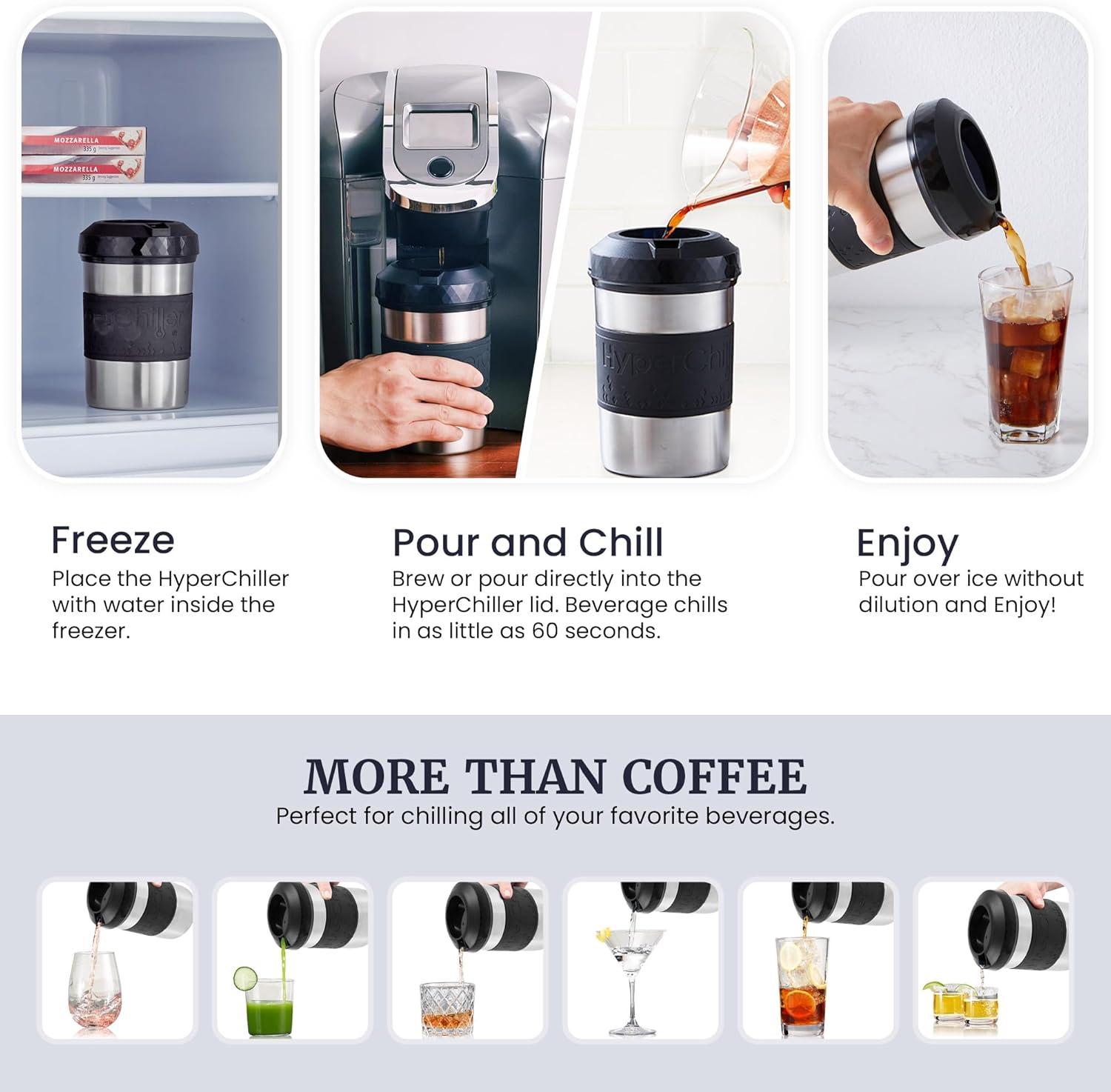 COMPATIBLE AND ADAPTABLE – It works with ALL types of coffee makers whether you use a single brew or a K-Cup by brewing directly in to your HyperChiller. Drip style model, no problem, simply pour the Coffee from the carafe and you are Iced in 60 seconds