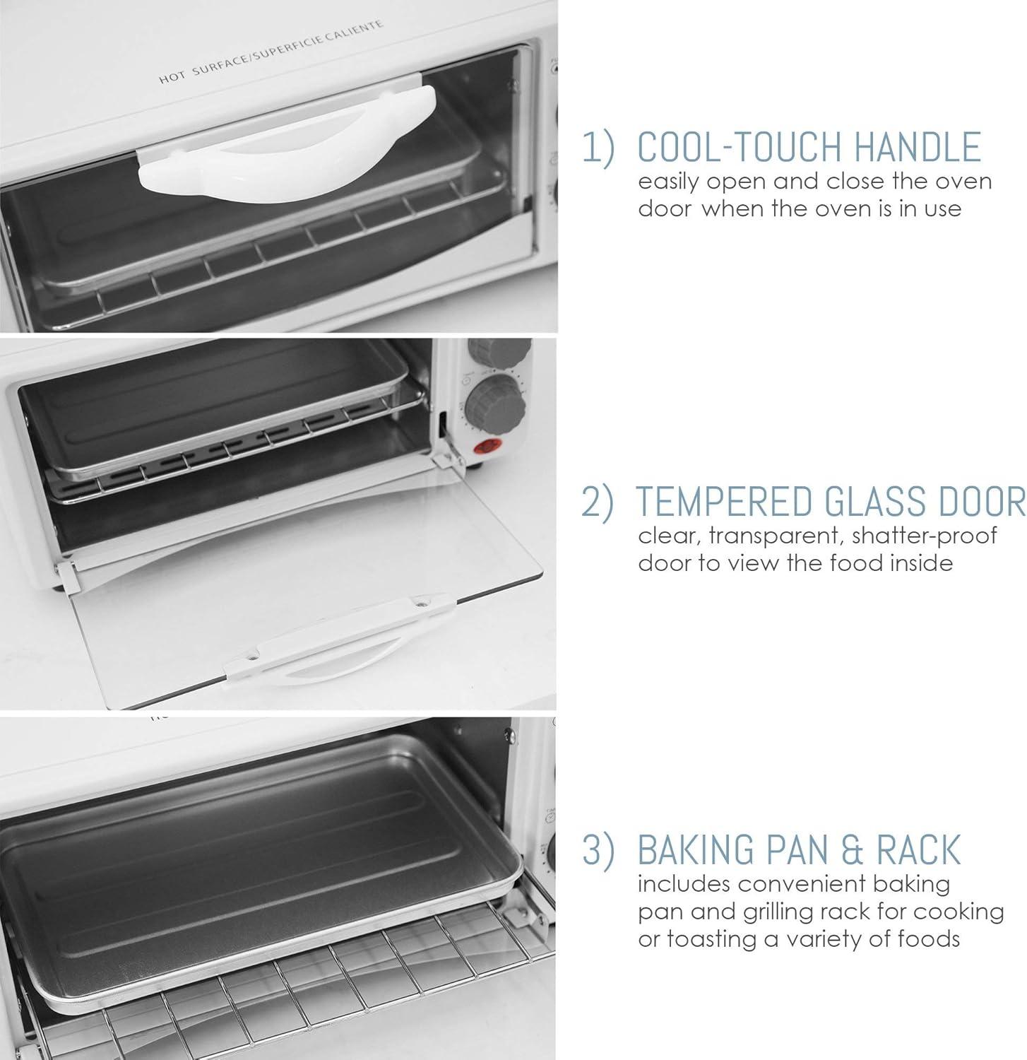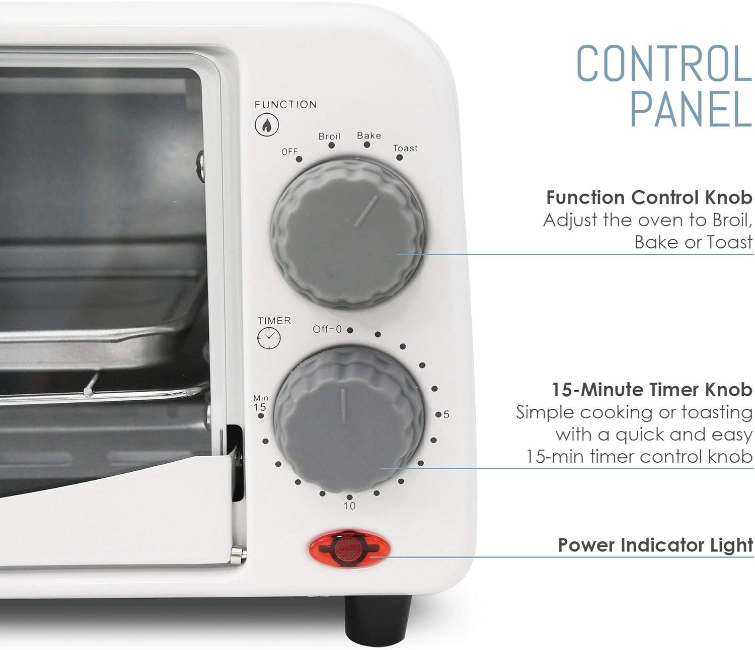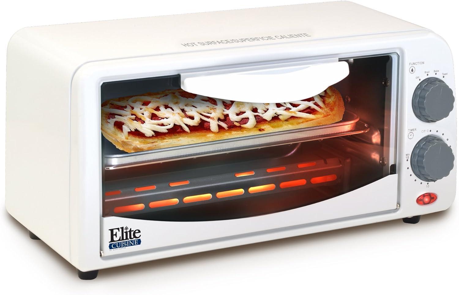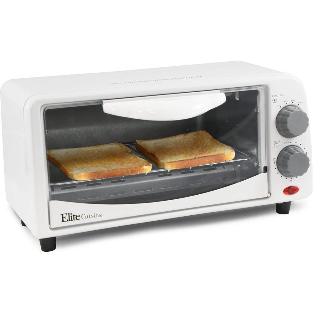 Stay toasty with the Elite Cuisine 2 Slice Toaster Oven. Toast bagels and bread, bake a personal pizza, or broil an open-faced sandwich. With an adjustable timer and heat selector functions, cooking is fast and easy. Bake, broil and toast settings all come with a 15 minute timer with auto shut off and ready bell signal. The Toaster has a tempered glass door and power indicator light. The Toaster includes a bake pan and wire rack. Powered at 650 watts. With its compact design, cleanup and storage is simple and hassle-free. The attractive white finish makes this toaster oven the perfect addition to any kitchen.